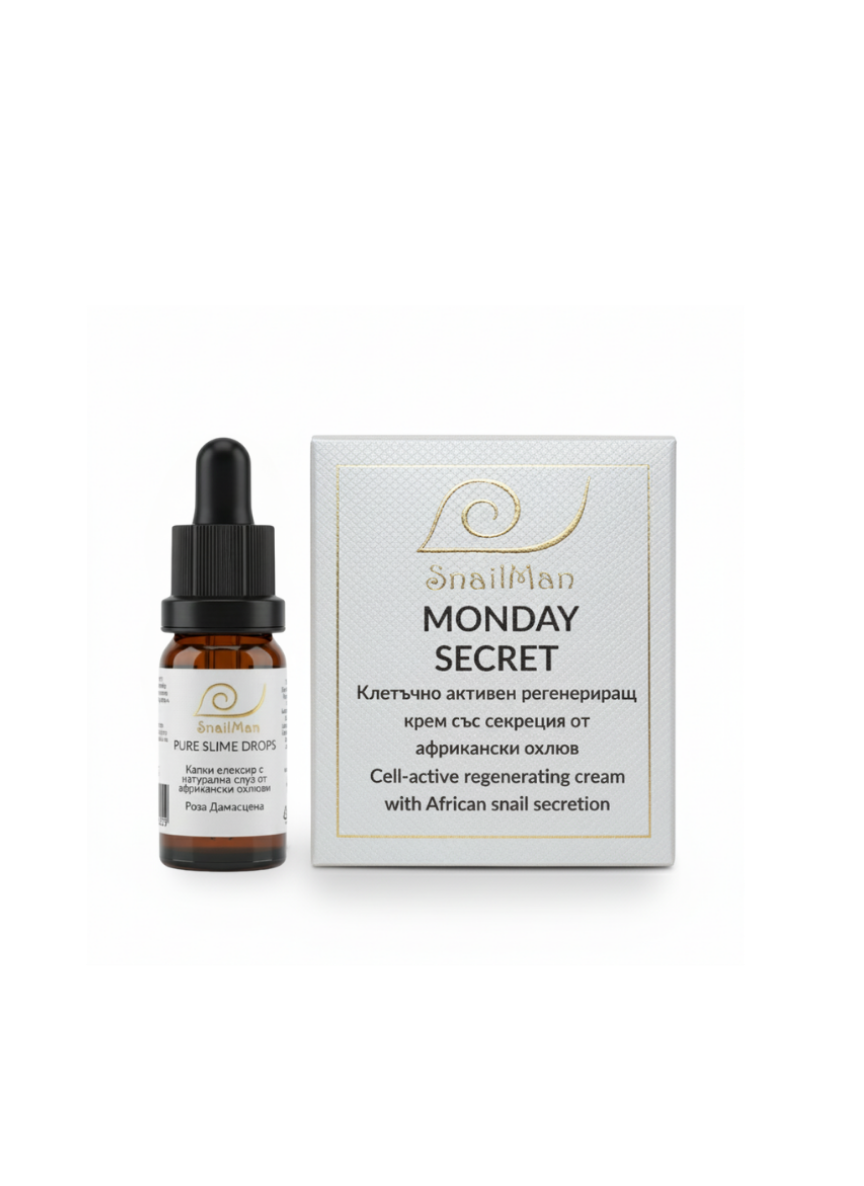 Комплект от клетъчно активен регенериращ крем „Monday Secret“, 50 мл и елексир „Pure Slime Drops“, 10 мл с охлювна слуз и цветя от Роза Дамасцена.